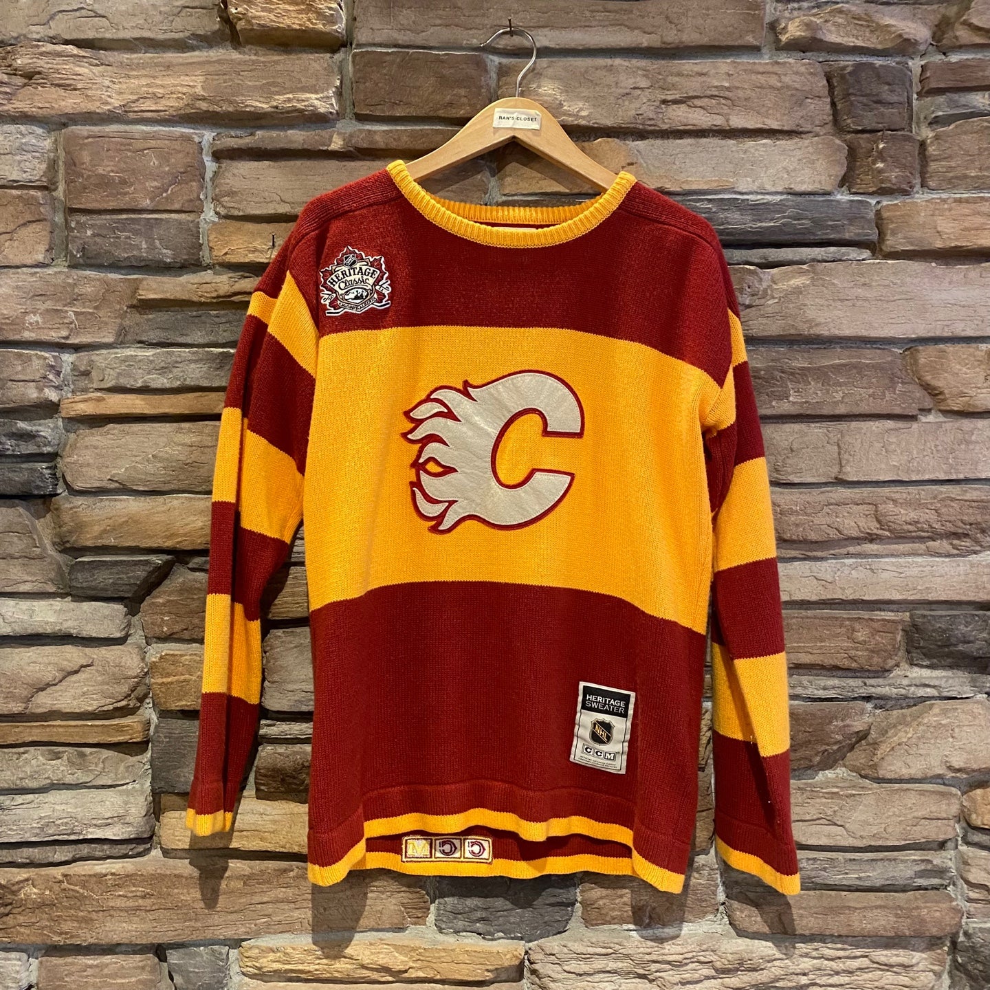2011 Heritage Classic Calgary Flames Striped Knit Jersey Sweater | Vintage Sweater | Vintage Jersey | Red & Yellow Flames Sweater | NPQ-2104