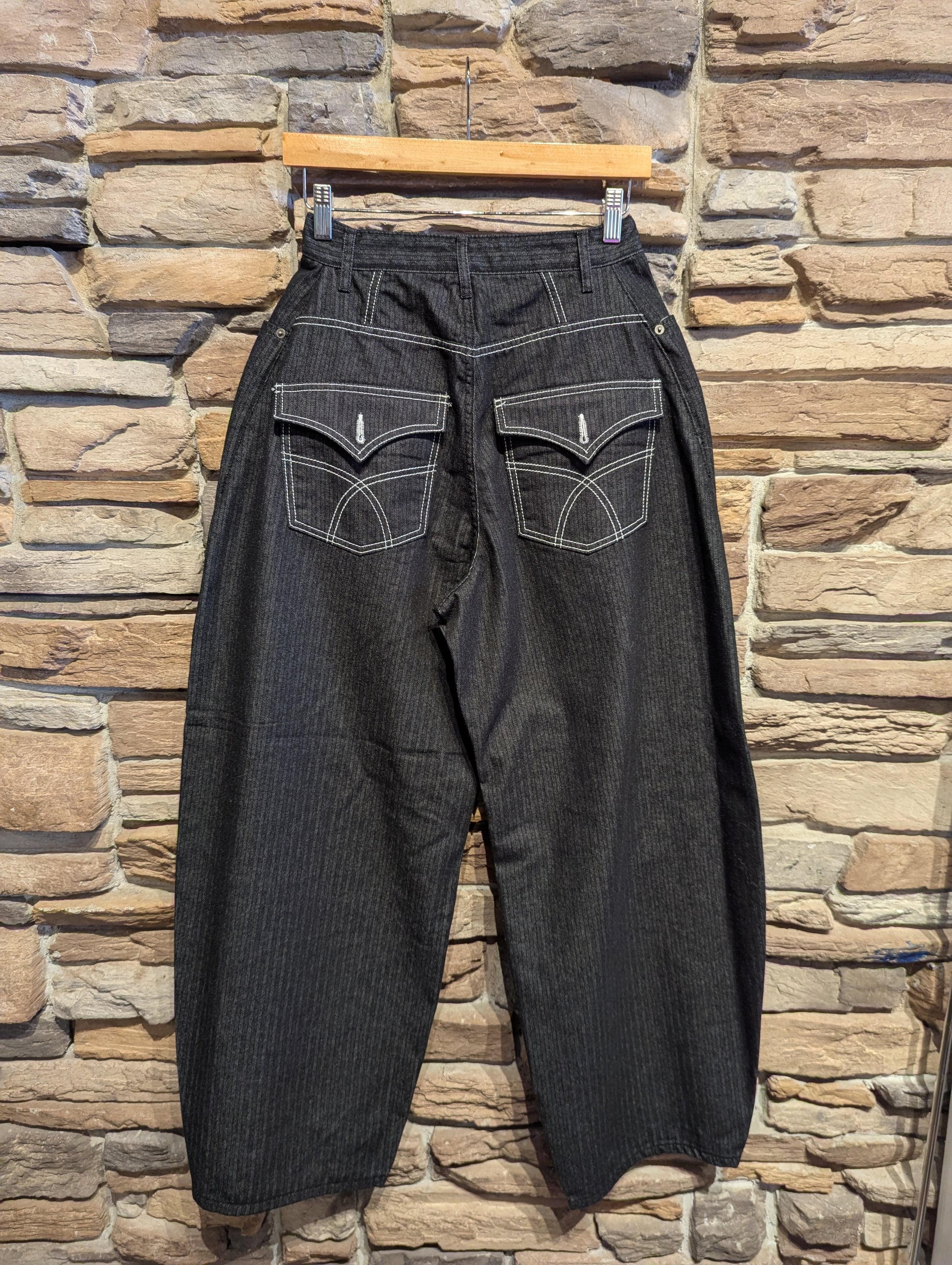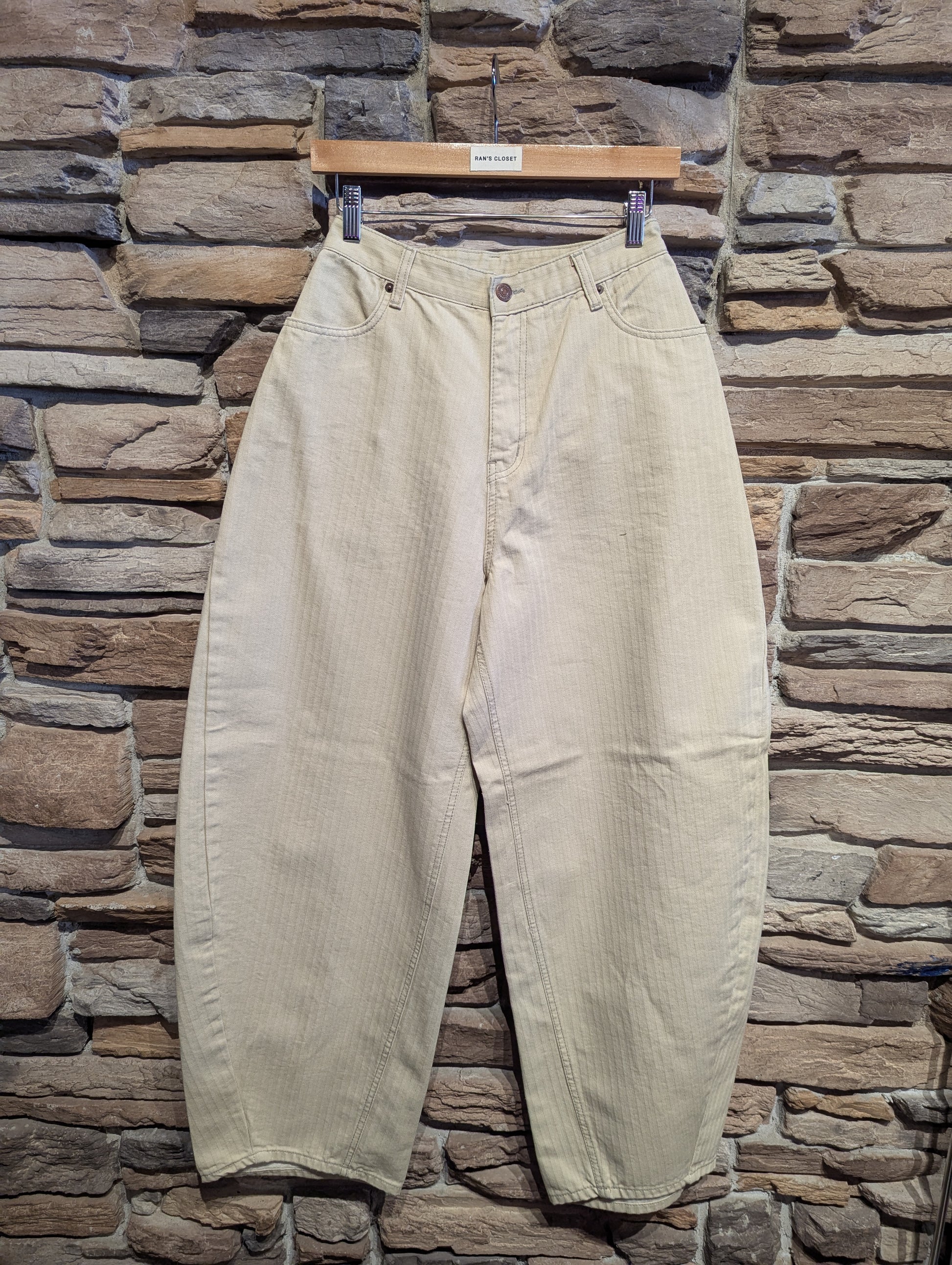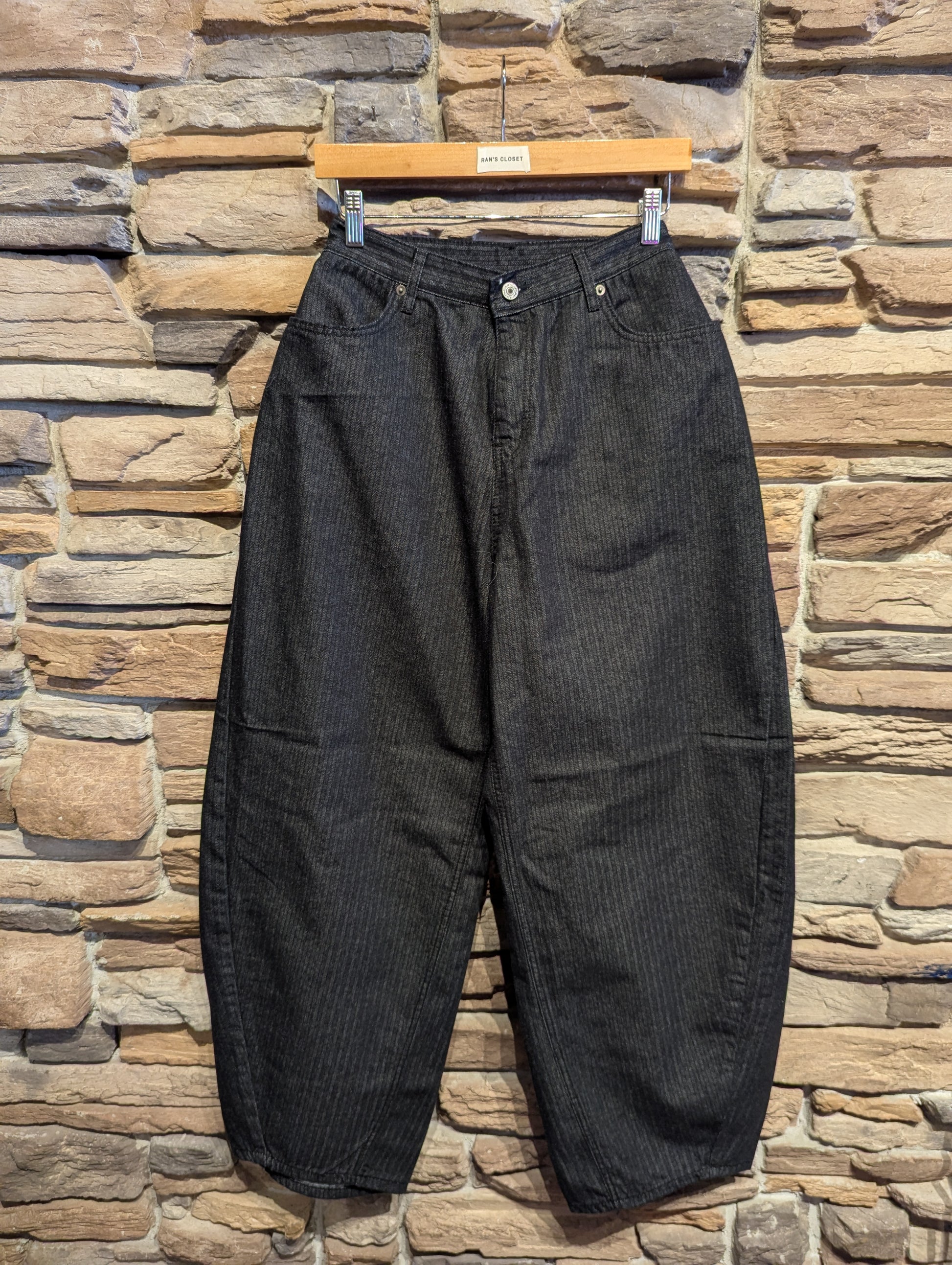 FLEECE LINED HIGH RISE BARREL JEANS WITH PINSTRIPES