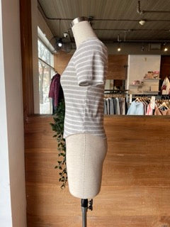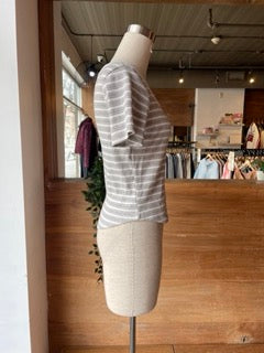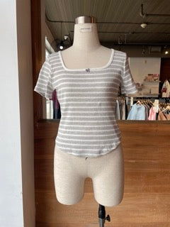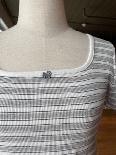 Although a basic, she's still a cutie. Ribbed cotton blend adorned with stripes and topped with a center bow at the neckline. The square neckline opens up the tee for a more relaxed feel.
