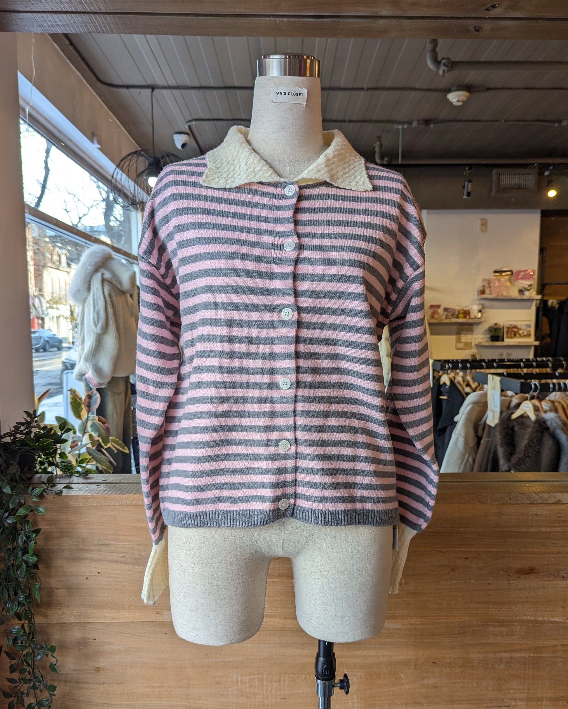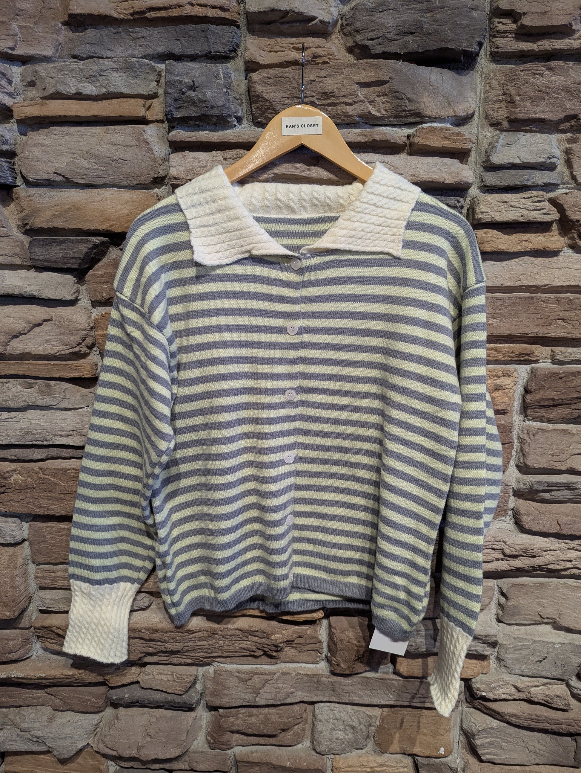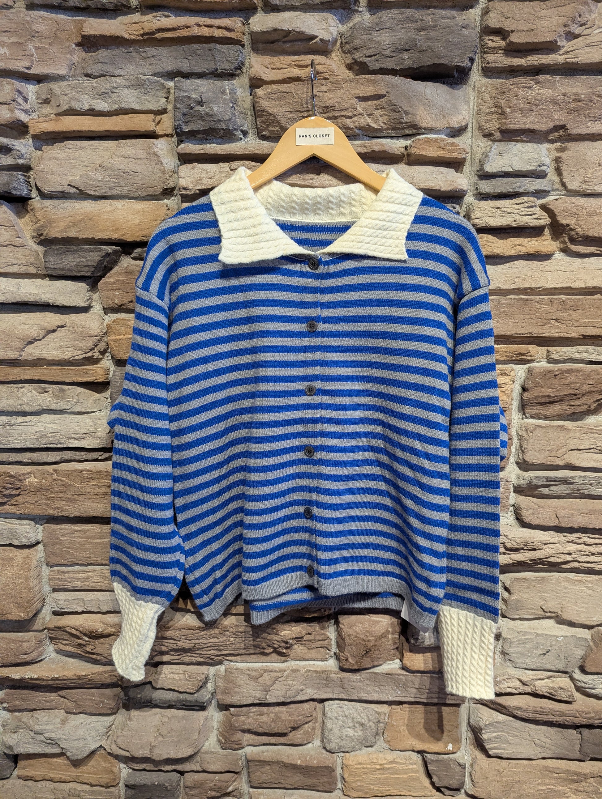 STRIPED BUTTON UP CARDIGAN WITH CABLE KNIT DETAILING