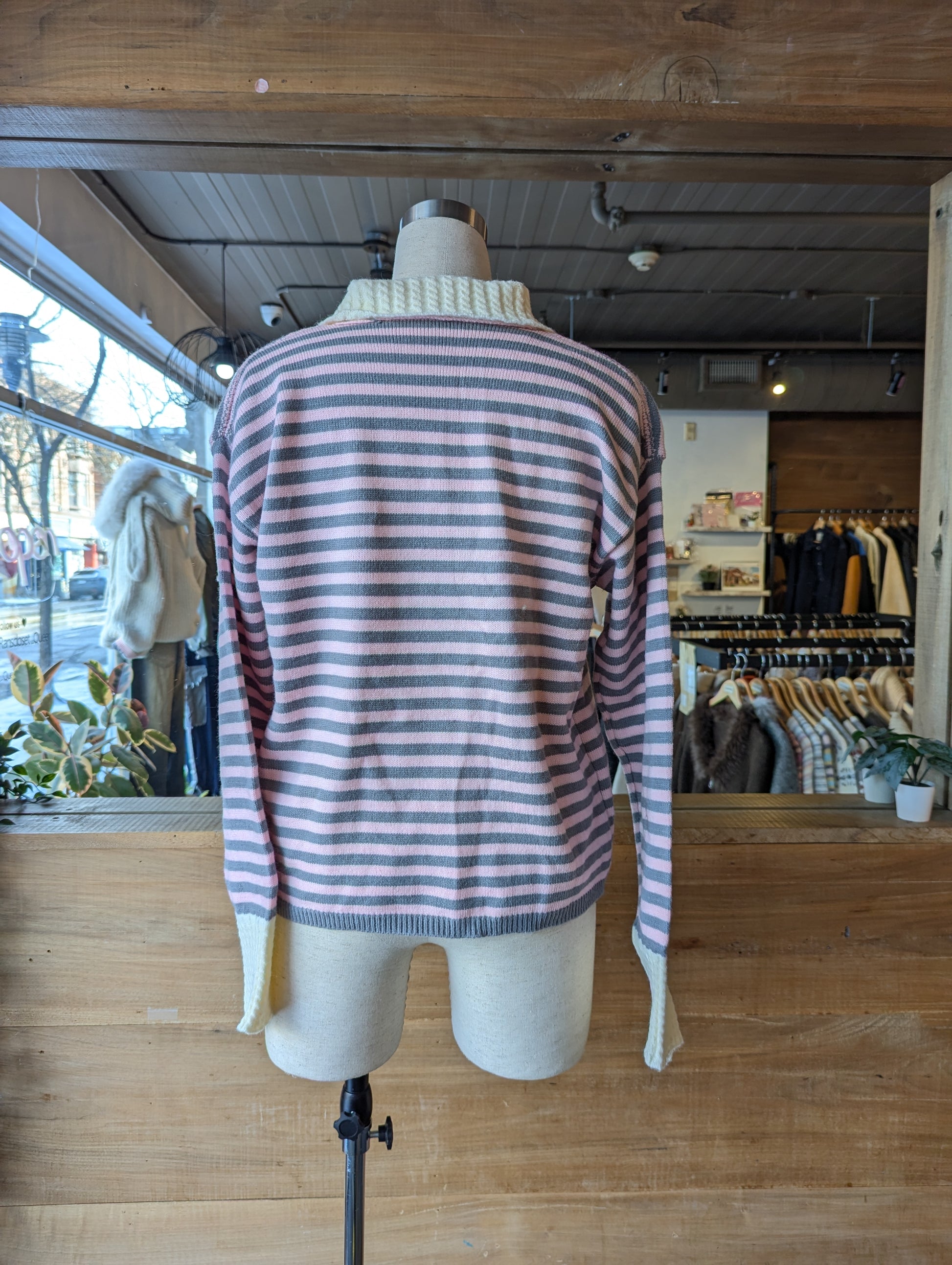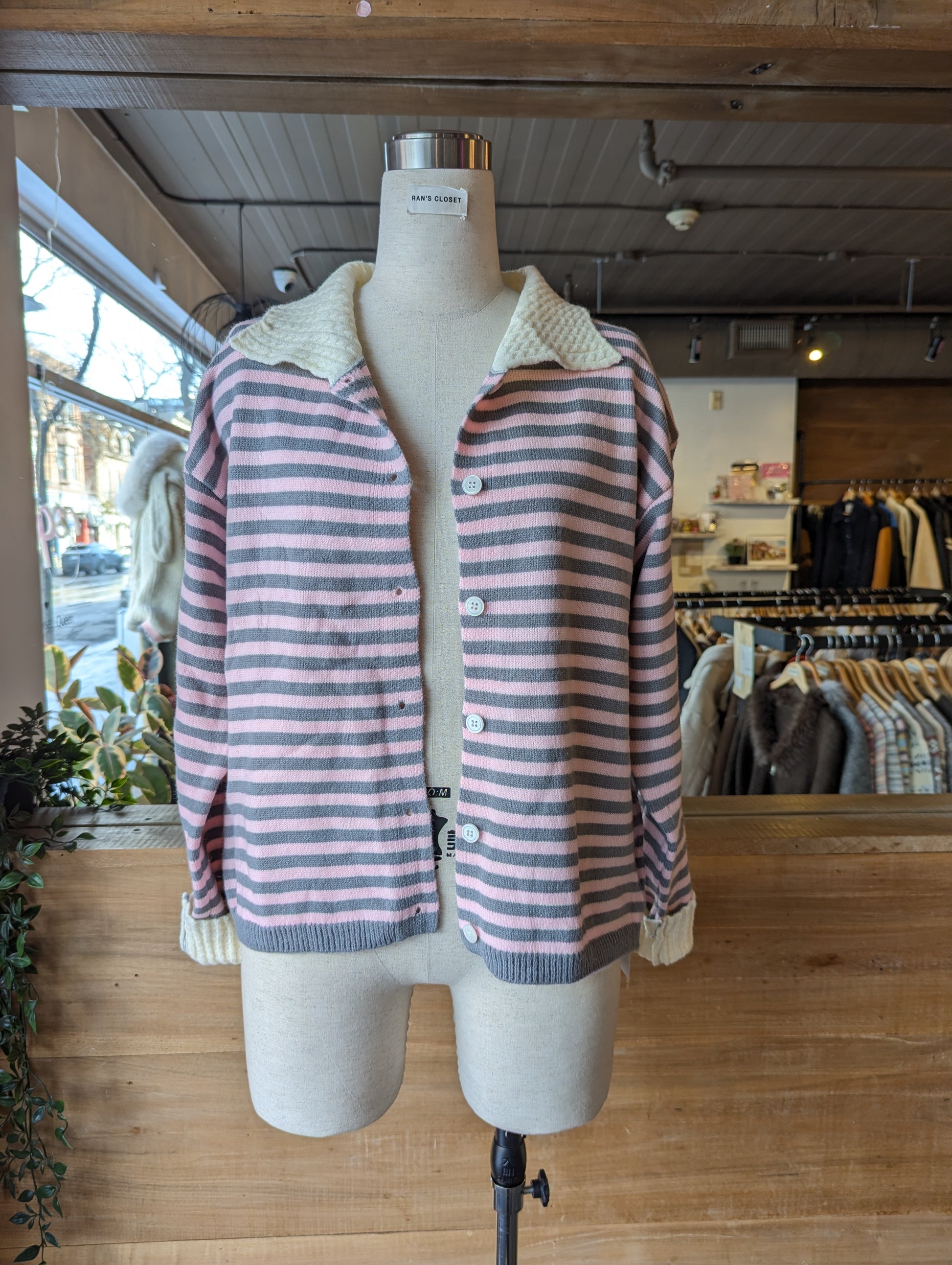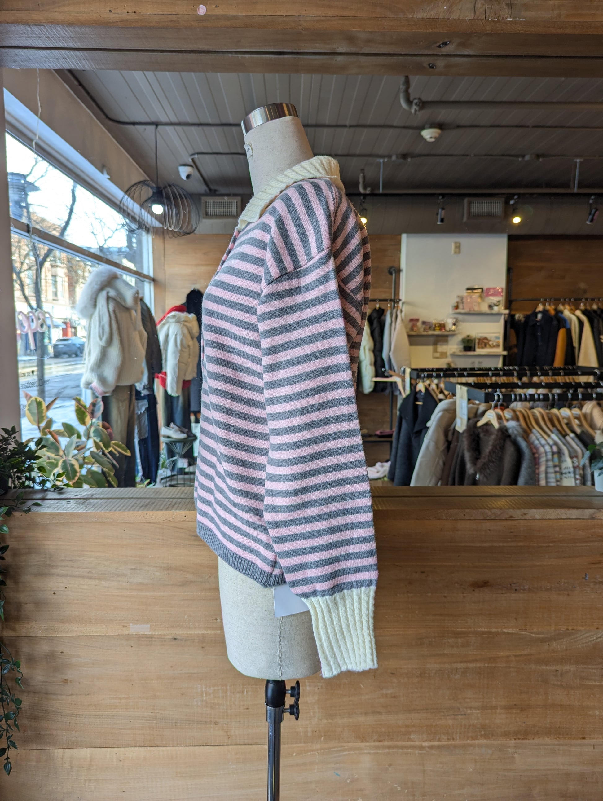 STRIPED BUTTON UP CARDIGAN WITH CABLE KNIT DETAILING