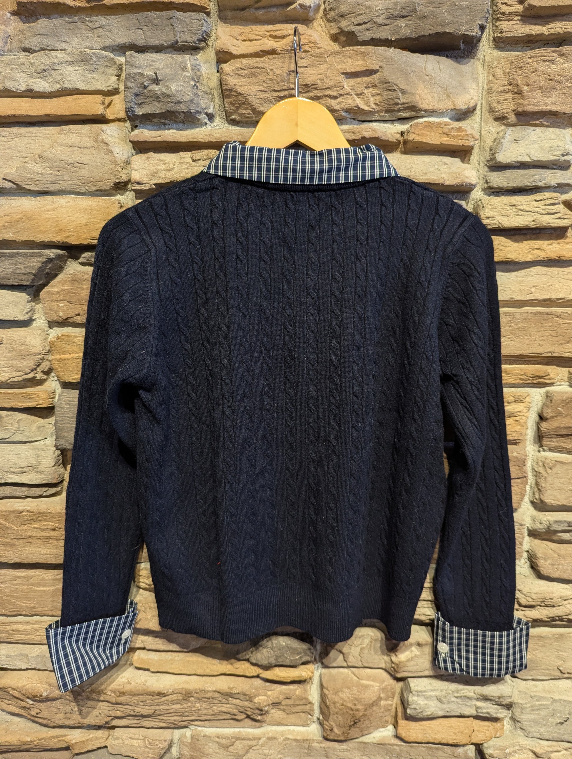 "U' Embroidered Cable Knit Cardigan with Plaid detail