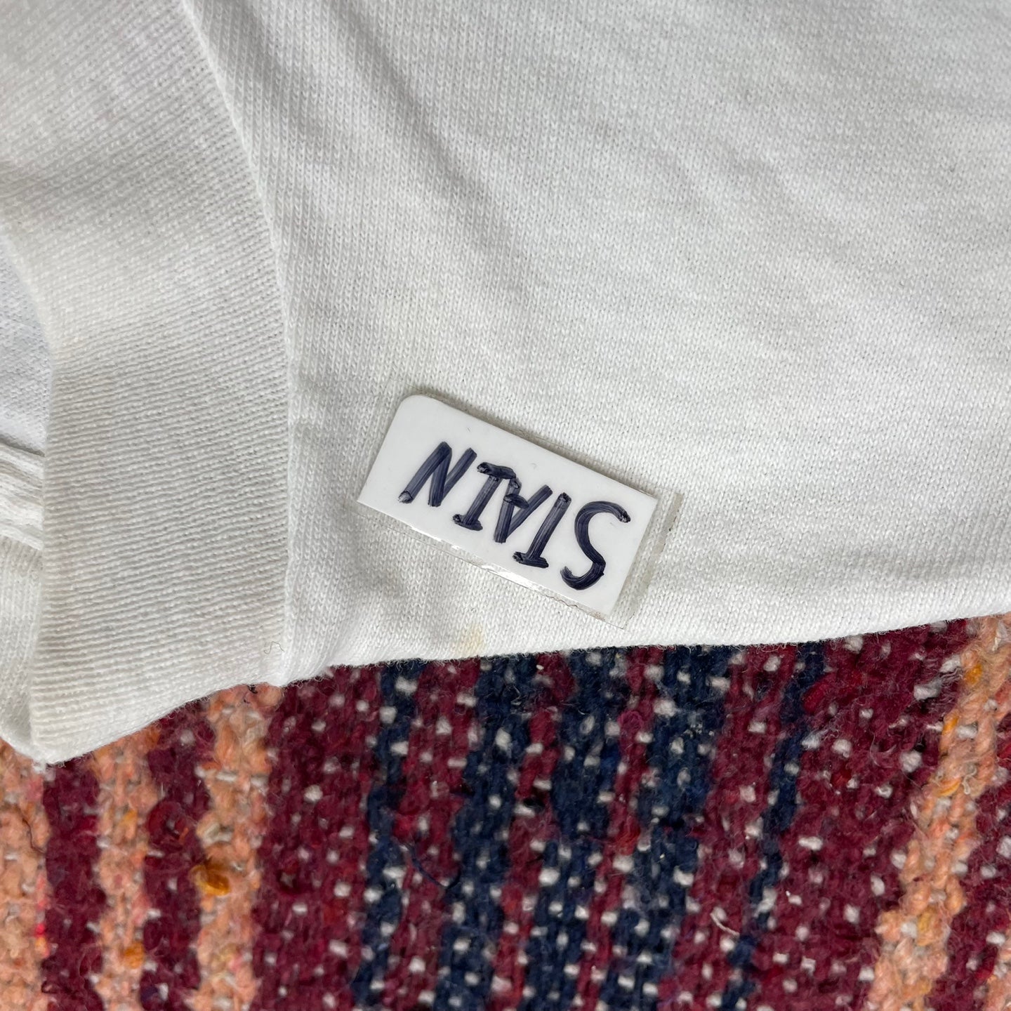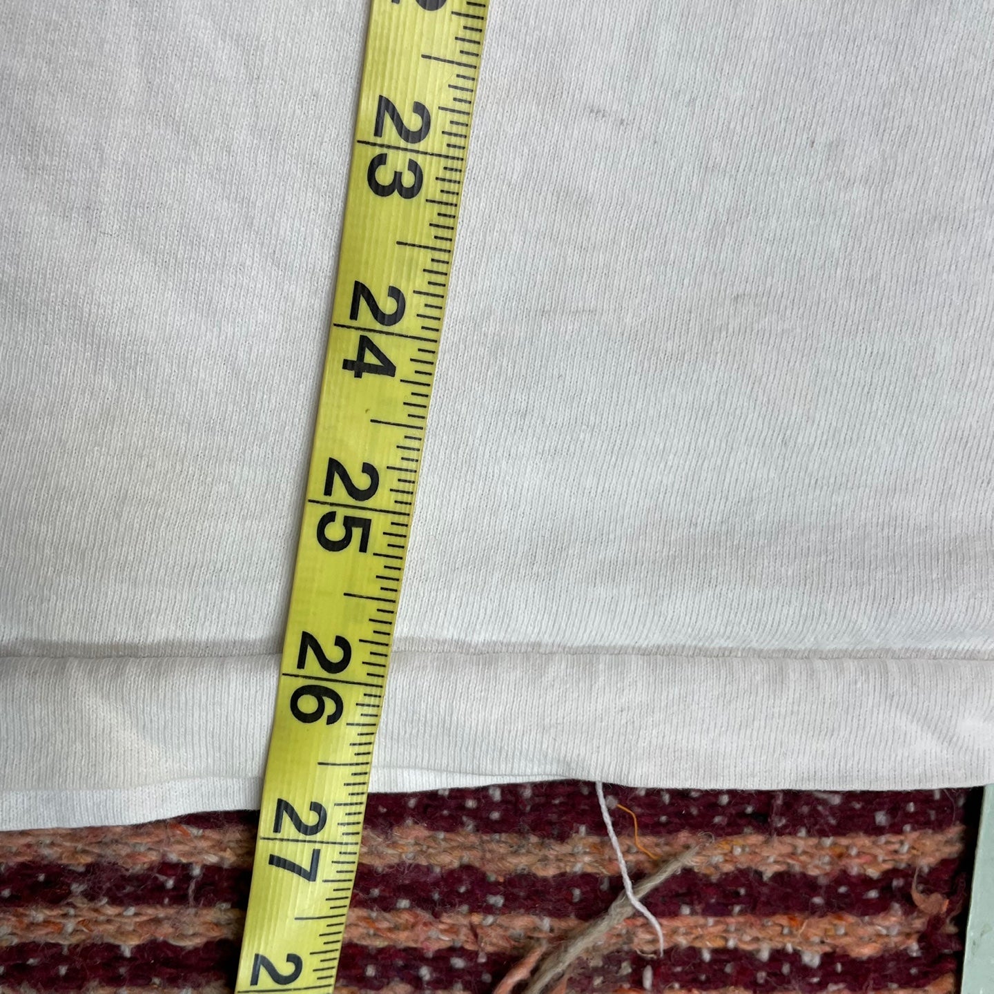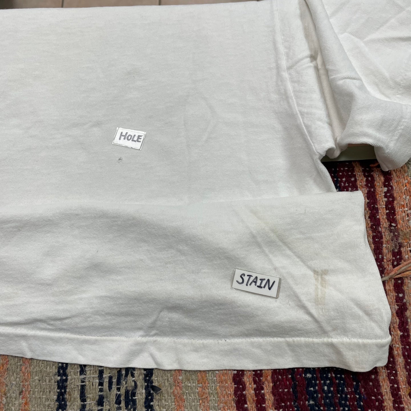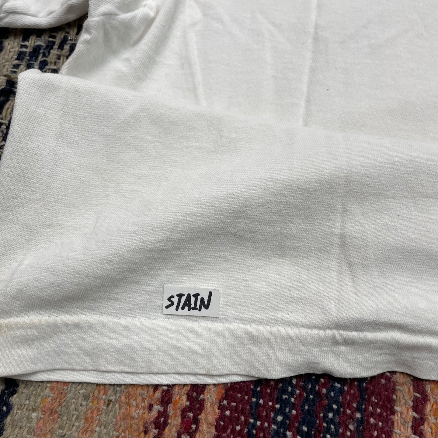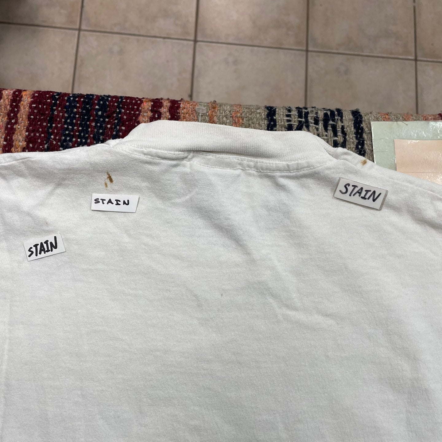 Used - Overall yellowing (concentrated near hem and around neck), staining on front and back, hole on back. Please refer to photos