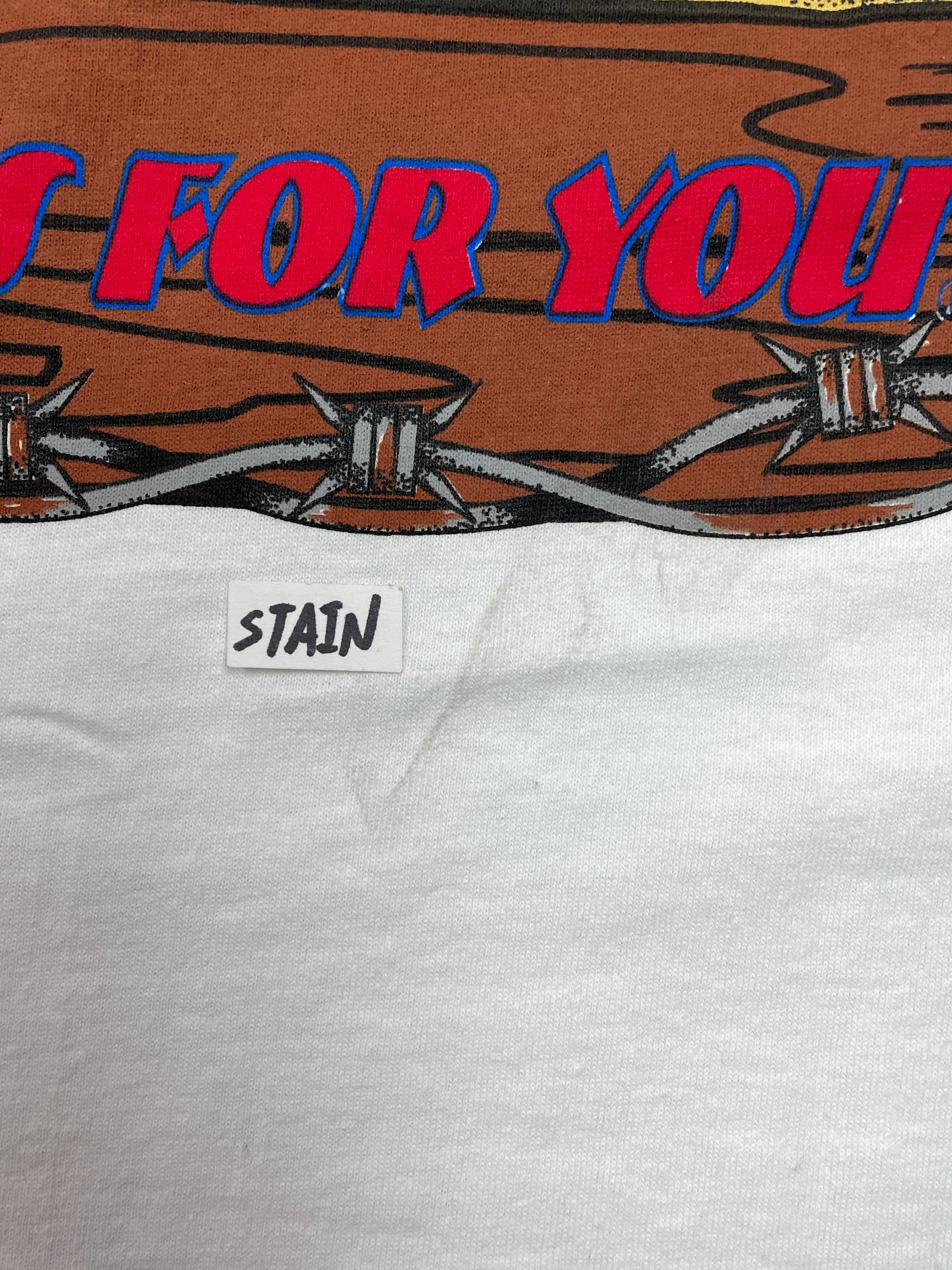 Used - Yellowing at collar, shoulders, front. Small stain on front right of collar. Stain on lower back below graphic. Please refer to photos.