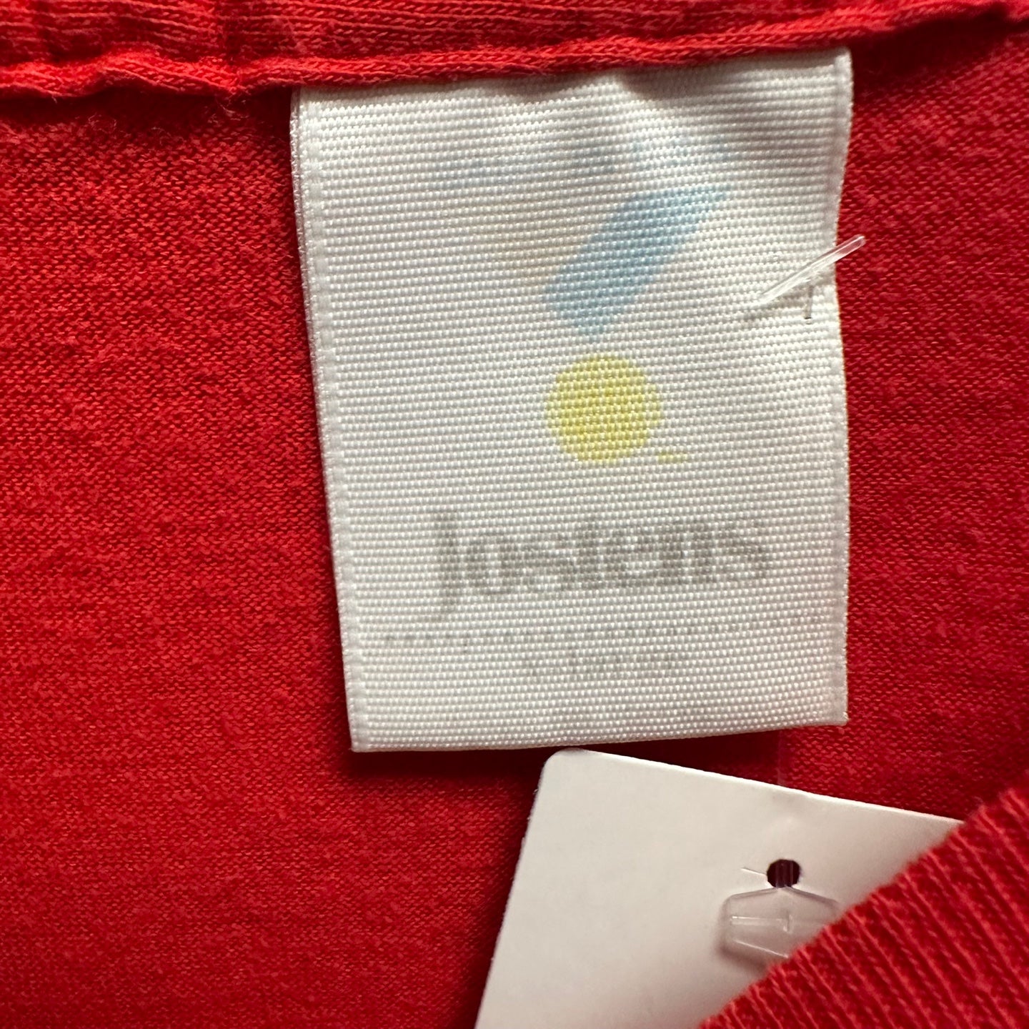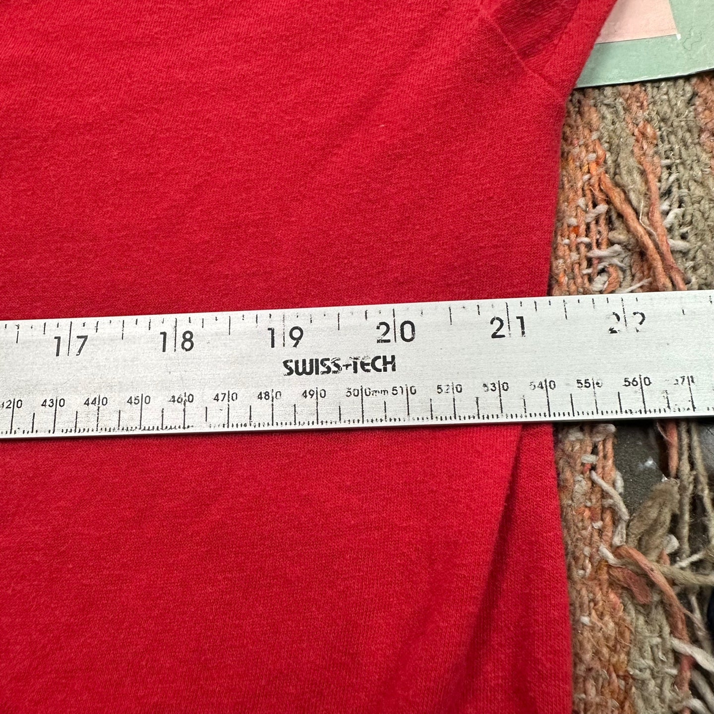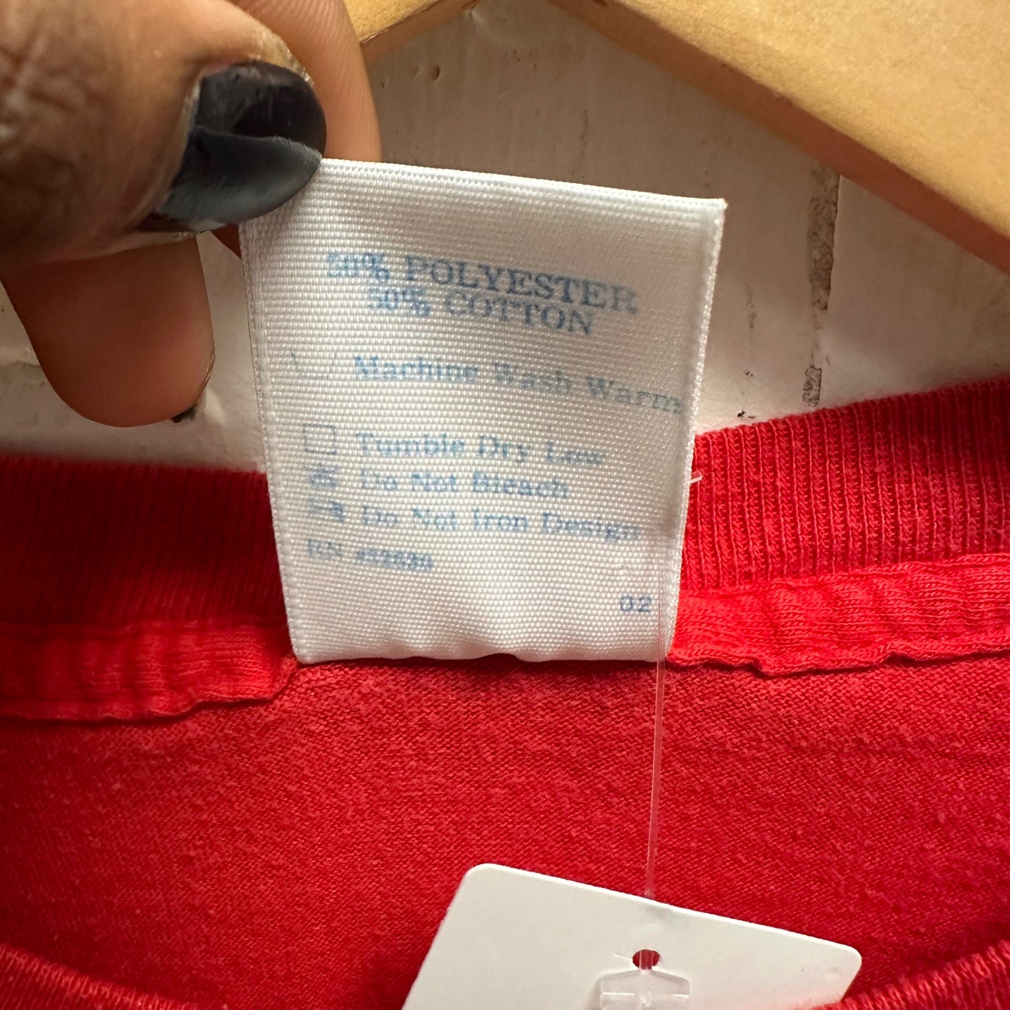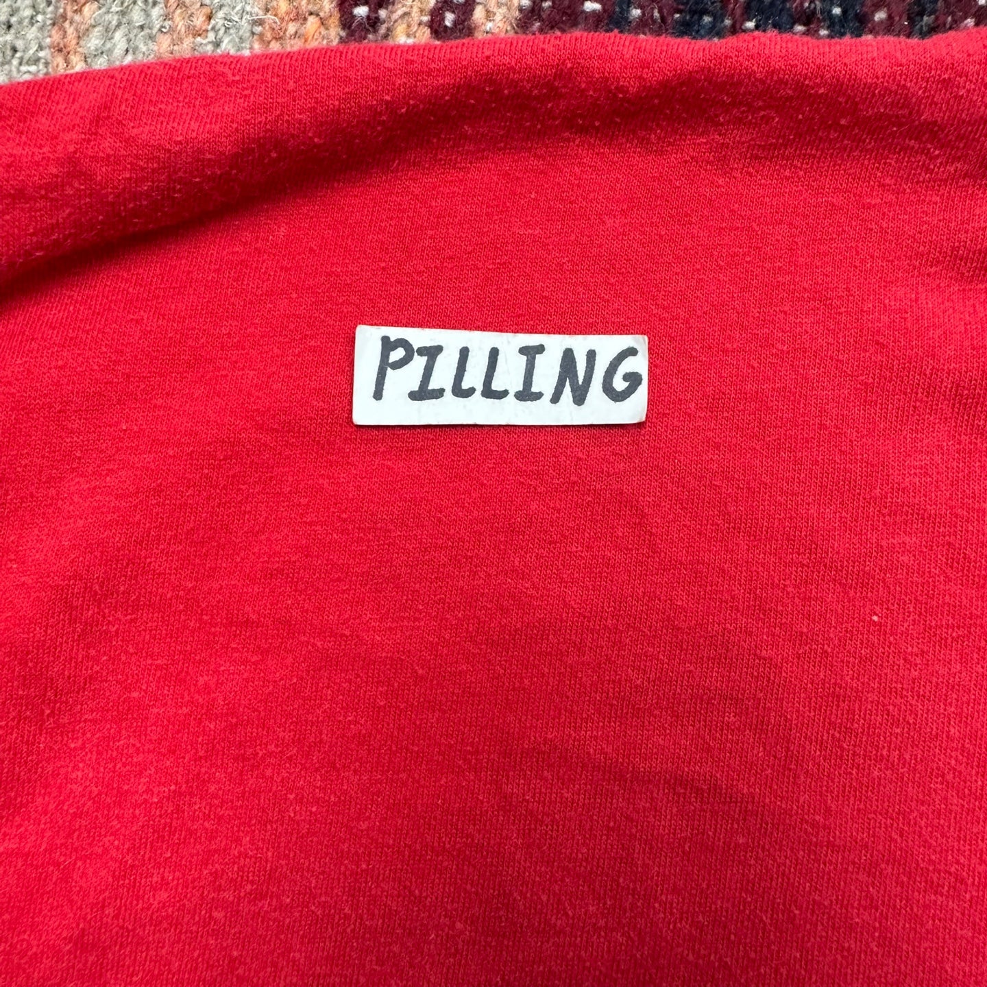 Used - overall wear and tear, general pilling throughout shirt, cracking across design, black stain near bottom of shirt