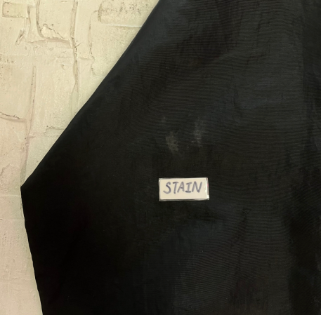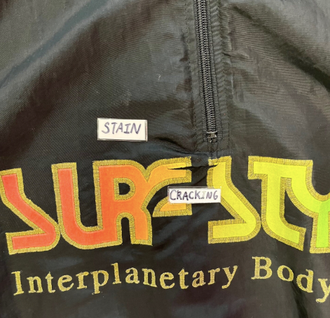Used - Stain on middle front. Cracking on center front and collar. Stain on left sleeve. Loose threads on bottom hem.