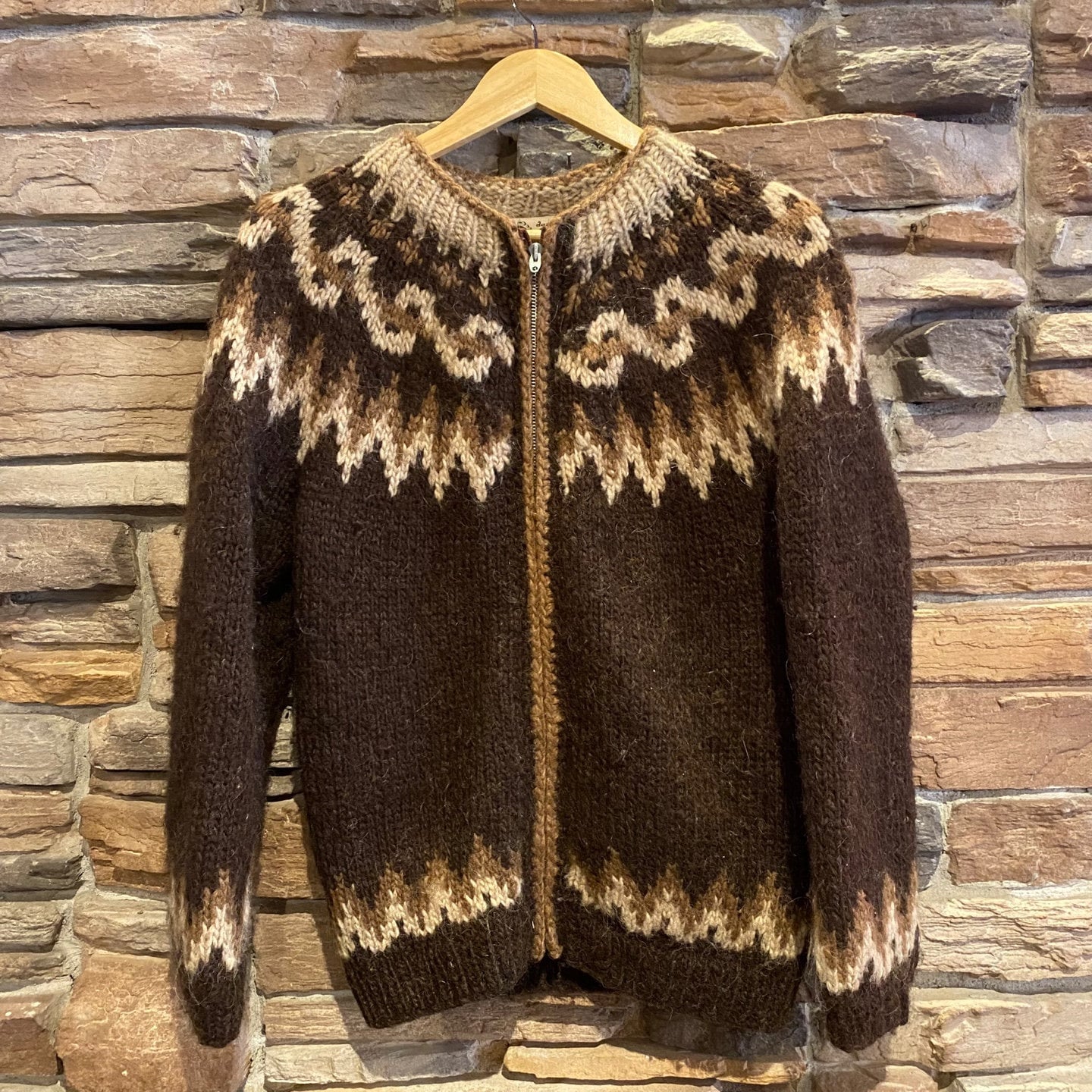 VINTAGE HAND KNIT DAVID GRAINS WOOL ZIP SWEATER | VINTAGE SWEATER | VIRGIN WOOL | ICELAND LOPI | BROWN PATTERN | SIZE M | SKU: STQ-3283