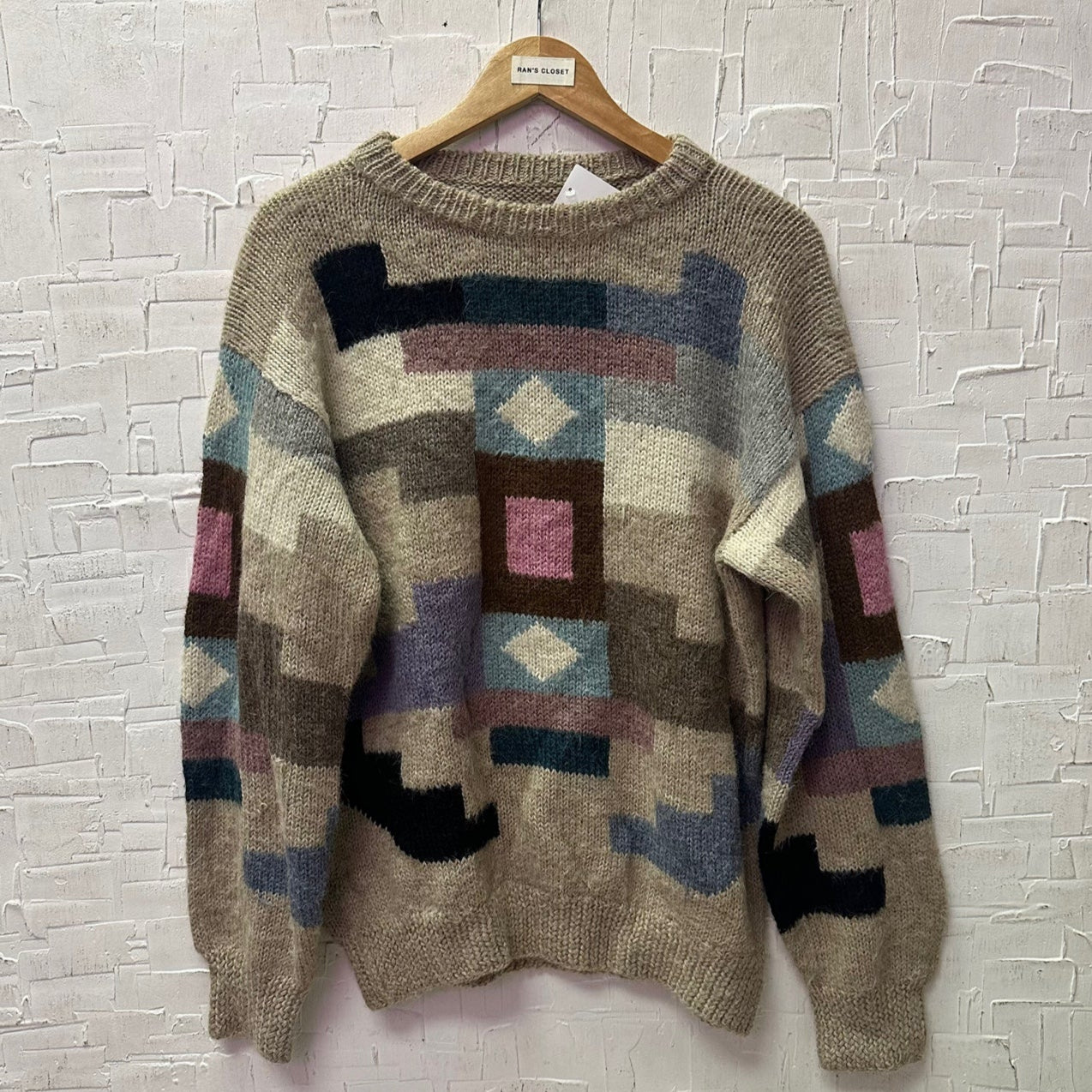 VINTAGE OATMEAL SWEATER WITH PASTEL GEOMETRIC SHAPES