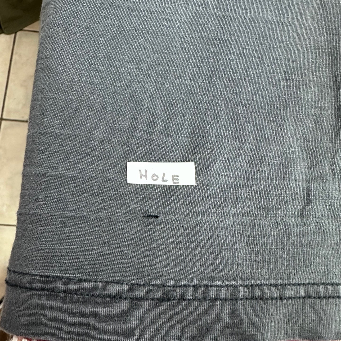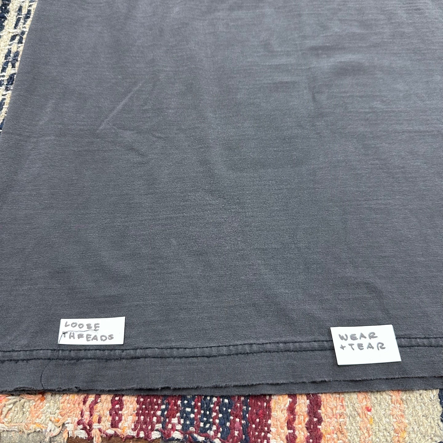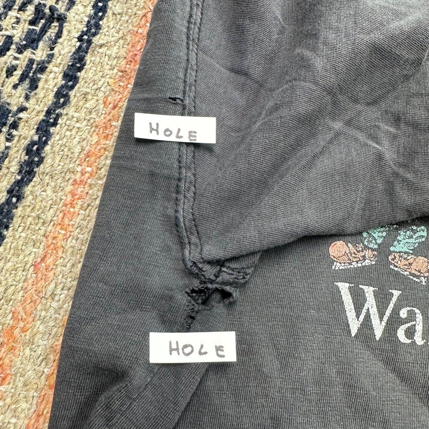 Used - Wear and tear around collar area and bottom hem. Fading on front and back graphic. Cracking on front and back graphic. Hole on underarms and lower left back. Loose threads on bottom hem. Stains on back right bottom hem. Missing tag.